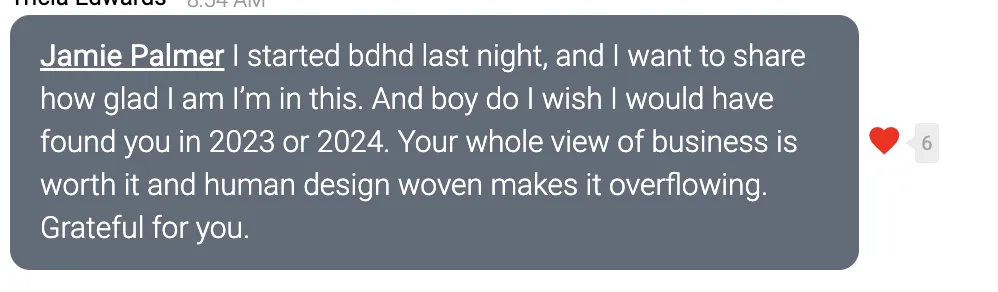 This course is a really good tool for deeper self-awareness, to support me while I’m discovering what works best for me/my business. Jaime has been a helpful and patient teacher in this journey. Jaime shines light on so many ways to leverage my human design in my business. I could go through the course material on my own 5 more times and each time I’d be able to layer on a new insight to be aware of, so that I can counterbalance any potential things that do not support my overall vision and mission for my business and life. While finding multiple ways to leverage other traits that show in my HD, but I hadn’t noticed in my life before. The fact that this is so personalized, and Jaime not only has 15+ years of experience running different types of businesses, but experience coaching clients while leveraging their HD in their business, makes this course so much more beneficial than all those cookie cutter/ “one size fits all” courses/programs out there.